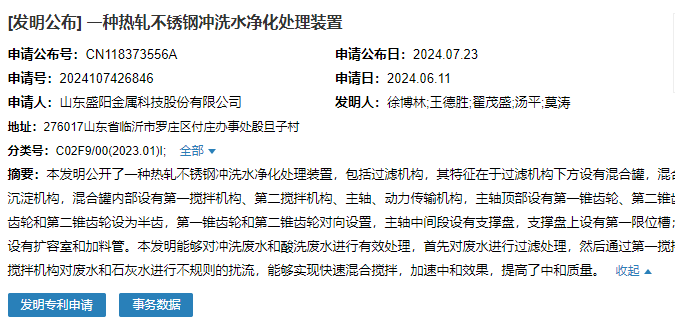 2024年7月23日,山东盛阳金属科技股份有限公司成功申请一项名为“一种热轧不锈钢冲洗水净化处理装置”专利,申请公布号为CN118373556A,申请日期为2024年6月11日。